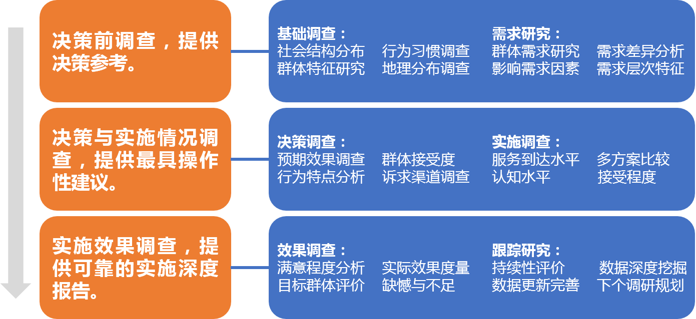 目前我國各級政府在追求發(fā)展效率的同時,也在積極推動和創(chuàng)建和諧社會,如何掌握社會需求,提供合理服務(wù),降低社會公共事務(wù)成本,取得工作好評對于決策和執(zhí)行層都非常重要。另外如何科學、合理、客觀地由社會對工作做出真實評估,對于總結(jié)特點、發(fā)揚優(yōu)勢、彌補不足更為重要。華夏經(jīng)緯在政府/協(xié)會等領(lǐng)域擁有豐富的資料、最新的政府統(tǒng)計信息及相關(guān)研究經(jīng)驗,并受到了各級政府和職能部門的充分肯定。
